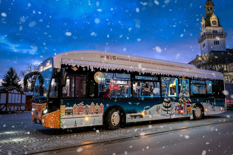 Schon von außen sind die Fahrzeuge ein echter Blickfang: eine weihnachtliche Winterstadt mit geschmücktem Tannenbaum, Rentieren und Weihnachtsmann im Schlitten soll die Bürgerinnen und Bürger in den Verkehrsgebieten der Kraftverkehrsgesellschaft Braunschweig (KVG) in diesem Jahr in Weihnachtsstimmung bringen und ein Lächeln auf die Gesichter zaubern. Doch damit nicht genug: Beim Einsteigen treten die Fahrgäste ein in eine bunte Weihnachtswelt voller Wichtel und weihnachtlicher Dekoration. Sogar an einen Selfie-Point wurde gedacht: Wer mag, kann sich als gesuchter Plätzchen-Dieb ablichten lassen.