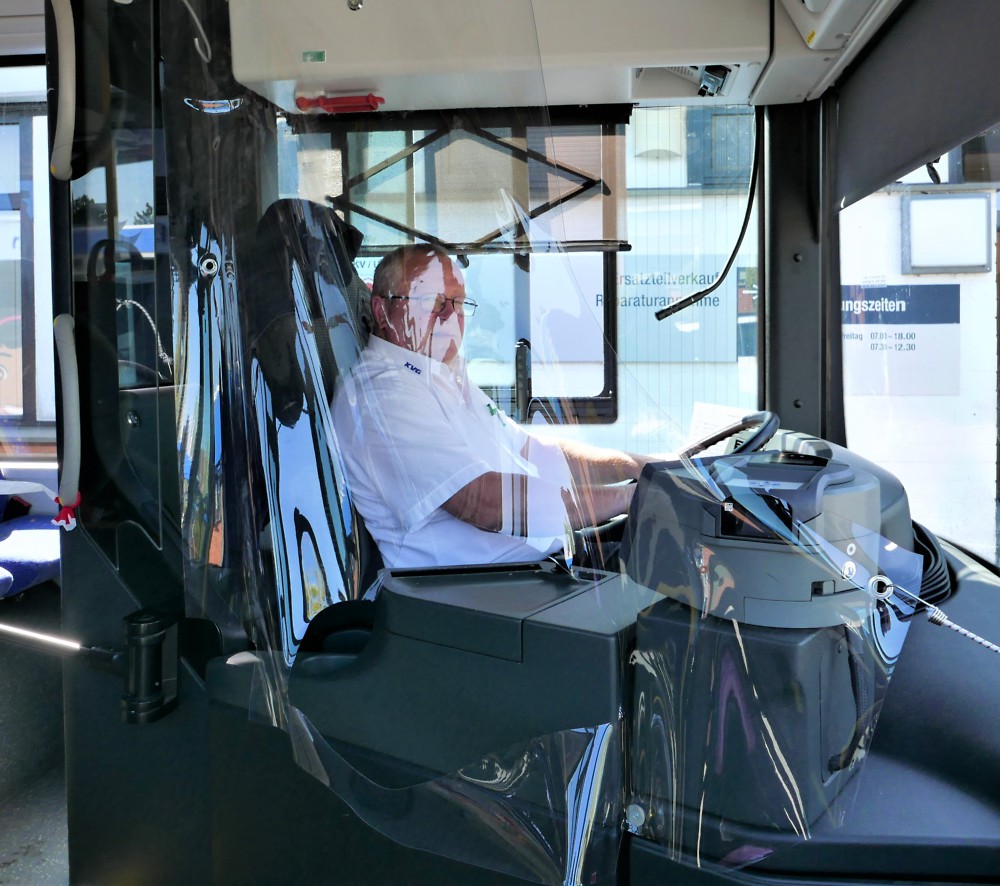 Mit dem Einbau einer Schutzvorrichtung für den Fahrpersonalarbeitsplatz wird der Einstieg an der vorderen Tür wieder stattfinden können. Die neue Abtrennung besteht aus einer ca. 0,5 Millimeter starken, durchsichtigen PVC-Folie. Als...