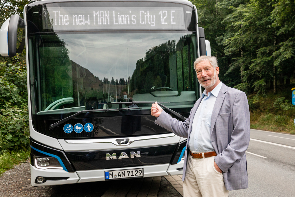 Innovativ und reichweitenstark: Der neue MAN Lion‘s City E beeindruckte bei der Präsentation auf dem Betriebshof der Kraftverkehrsgesellschaft mbH Braunschweig (KVG) in Bad Harzburg alle anwesenden Gäste. Thomas Flentge und Mike...