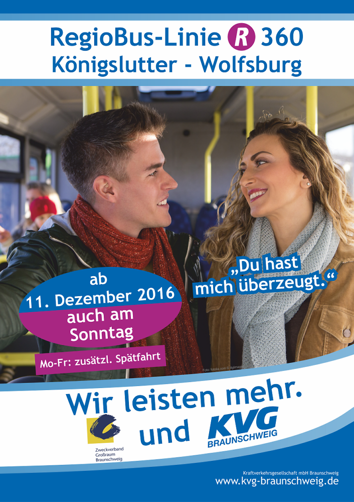 Am 11. Dezember 2016 tritt auf den Buslinien 360, 370, 372, 380, 382, 393 und 394 der Kraftverkehrsgesellschaft mbH Braunschweig (KVG) im Verkehrsgebiet Helmstedt ein neuer Fahrplan in Kraft. Auf der RegioBus-Linie 360 bietet die KVG mit sechs... ...