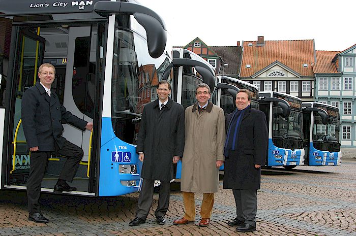 Fünf Busse werden davon im Bereich Stadt Helmstedt / Landkreis Helmstedt im Linienverkehr eingesetzt. Der Landrat Herr Matthias Wunderling-Weilbier und der Bürgermeister der Stadt Helmstedt Herr Wittich Schobert freuen sich gemeinsam mit dem KVG-Geschäftsführer Axel Gierga über die Auffrischung der Fahrzeugflotte und stellten die Fahrzeuge der Öffentlichkeit in Helmstedt auf dem Marktplatz vor.