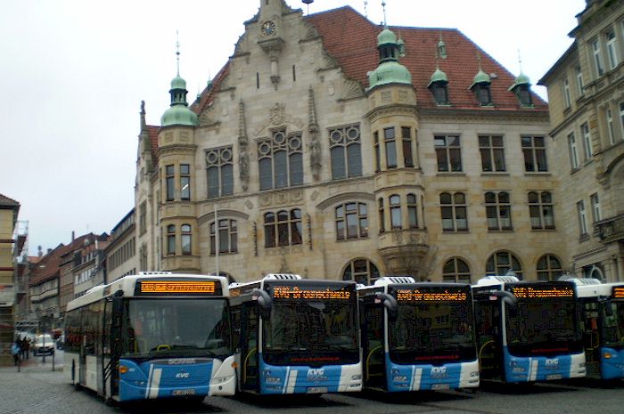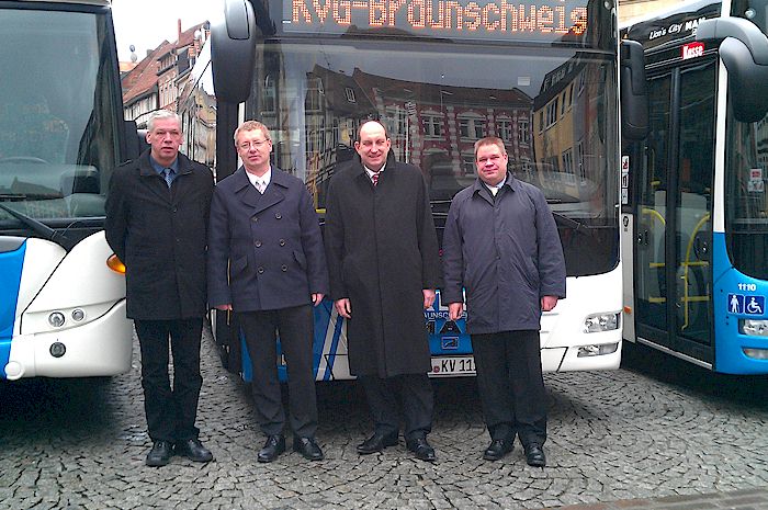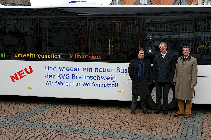 Und in Wolfenbüttel stellte die KVG nur wenige Stunden später auf dem Rathausplatz die neuen Busse für ihren Stadtverkehr dem Bürgermeister der Stadt, Thomas Pink, vor.