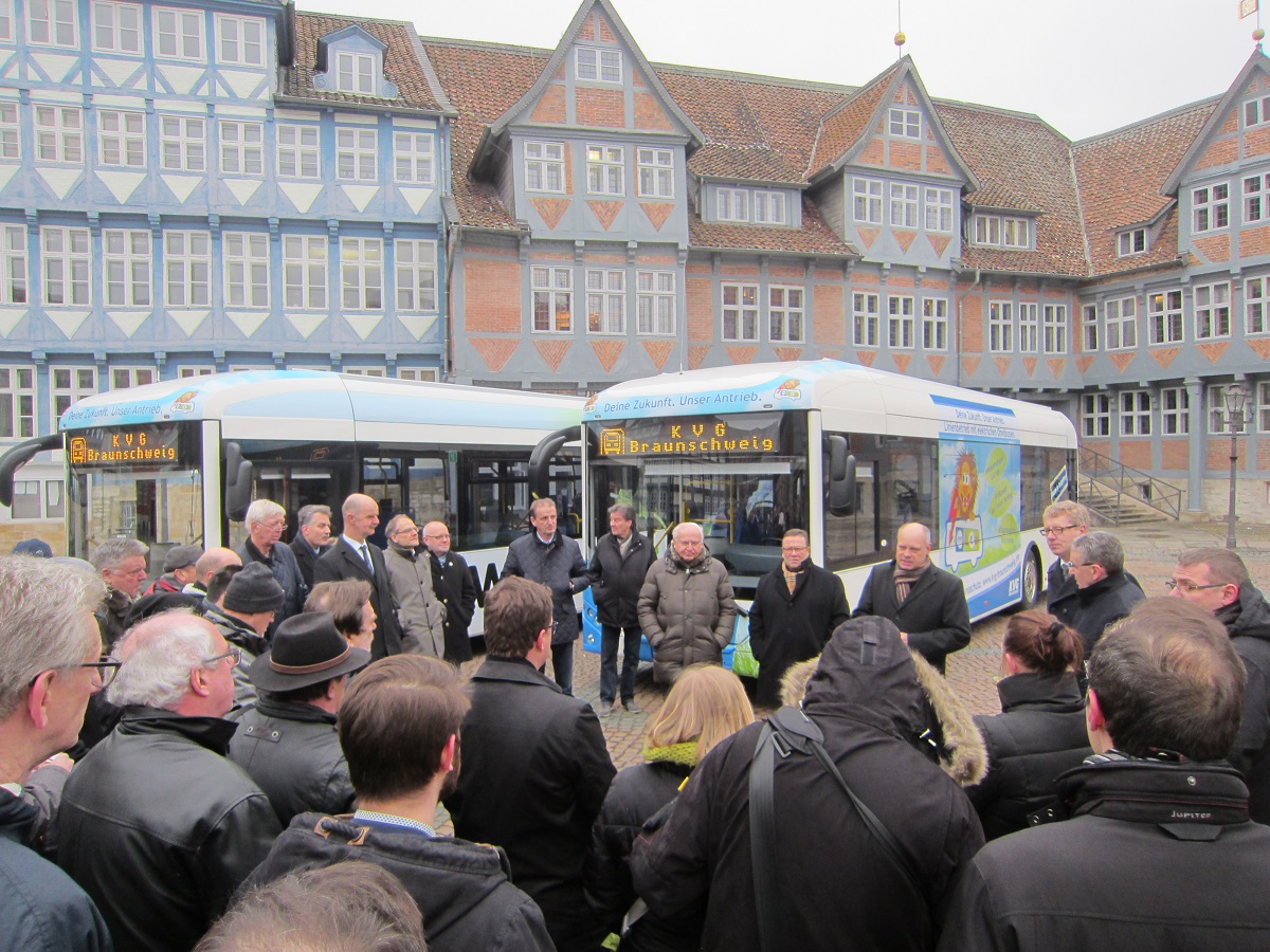 Die Kraftverkehrsgesellschaft mbH Braunschweig (KVG) stößt das Tor zur Elektromobilität im Linienbetrieb weit auf: Erstmals gehören Busse mit schadstofffreiem Antrieb zum Fuhrpark des Unternehmens. Diese wurden am 07. Februar 2017 auf dem Stadtmarkt Wolfenbüttel offiziell in Dienst gestellt. Die landesgeförderten Elektrofahrzeuge nahm Ministerialdirigent Dr. Christoph Wilk, vom Niedersächsischen Ministerium für Wirtschaft, Arbeit und Verkehr, Abteilungsleiter Verkehr, persönlich in Augenschein. Mit ihm ließen sich weitere Vertreter aus Politik und Gremien die neue Antriebstechnik erläutern. Zudem nutzten sie die Möglichkeit zu einer Testfahrt durch das Stadtgebiet Wolfenbüttel. Von den drei beschafften Elektrobussen des Herstellers Sileo aus Salzgitter setzt die KVG je ein Fahrzeug im Linienbetrieb des Stadtverkehrs Wolfenbüttel, Salzgitter und Helmstedt ein. Deren garantierte Reichweite pro Batterieladung beträgt mehr als 200 km.