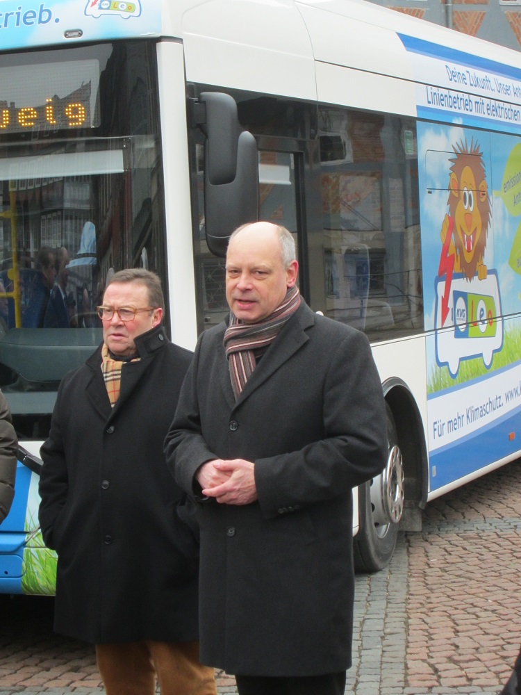 Der gegenüber Dieselbussen deutlich reduzierte Lärm macht sich bei Fahrgästen, Anwohnern und Passanten gleichermaßen bemerkbar. Die KVG-Elektrobusse fahren ohne den Ausstoß von Schadstoffen wie CO2, Feinstaub, Schwefeldioxid oder Stickoxid und sind somit emissionsfrei. Sie werden mit Strom aus 100 Prozent erneuerbaren Energien des jeweiligen lokalen Energieversorgers geladen. Thomas Pink, Bürgermeister der Stadt Wolfenbüttel, begrüßt den Einsatz eines Elektrobusses: „Die Stadt Wolfenbüttel bietet ihren Bewohnern eine hohe Lebensqualität. Dazu trägt auch das gute städtische ÖPNV-Angebot bei. Zusätzlich wird die elektrische Antriebsart durch weniger Lärm und Schadstoffe die Aufenthaltsqualität aller Bürger der Stadt weiter verbessern. Die Stadt Wolfenbüttel setzt als Gesellschafter der KVG mit Ihrem Votum für den Elektrobus auch ein klares Bekenntnis zum städtischen Klimaschutz.“