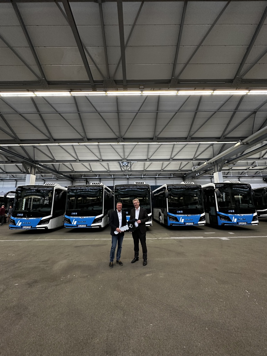 MAN Truck & Bus liefert insgesamt 5 MAN Solo Lions City LE Dieselbusse an die Kraftverkehrsgesellschaft Braunschweig (KVG) aus. Vier Gelenkbusse mit Efficient Hybrid des Typs Lions City G folgen Anfang 2024. Die Übergabe der fünf Dieselbusse an die KVG fand durch Key Account Manager Thomas Flentge von MAN Truck und Bus am 20.12.2023 in Salzgitter statt. „Auch wenn die Zeit der Beschaffungen von Dieselbussen für uns zu Ende geht, freuen wir uns sehr, dass wir für diesen Auftrag wieder mit unserem langjährigen Partner MAN zusammenarbeiten können“, so Axel Gierga, Geschäftsführer der KVG. Die Busse werden in allen Verkehrsgebieten der KVG eingesetzt. Der Gesamtauftragswert der Bestellung liegt bei ca. 2,5 Mio. Euro, wobei der Anteil der Förderung durch die Landesnahverkehrsgesellschaft Niedersachsen (LNVG) bei ca. 1 Mio. Euro liegt.