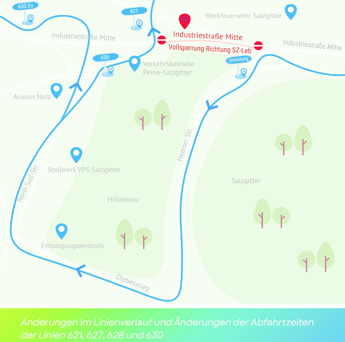In der Fahrtrichtung „Abzw. MAN -SZ-Lebenstedt" verlängert sich die Fahrzeit durch die Baustelle um sieben Minuten, so dass sich die Ankunft in SZ-Lebenstedt ebenfalls um sieben Minuten nach hinten verschiebt. Bei allen Haltestellen zwischen „Hallendorf,Brunnenriede" und „SZ-Leb.,Ladenzentrum" verschieben sich die Abfahrtzeiten entsprechend um sieben Minuten nach hinten.